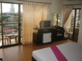 ナナイロード、上に紹介してますラビットマンションの向かいです。外観も小さくあまり目立たないのですが部屋は割と広く心地よさそうです。三角枕とブランケットの色がミスマッチしていますがTV、ミニバー、お酒類、スナック(有料)などもおいてあり、バルコニーつきです。ローシーズン一泊800バーツと値段はそこそこです。