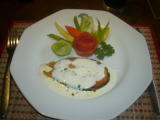 軽く揚がったサーモンステーキに少しだけ甘いヨーグルトソースがかかってます。