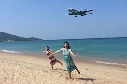 プーケットのマイカオビーチでは、頭上スレスレに走る