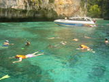 そして次に来るのがマヤから約5分かけて着くシュノーケリングポイントLoh Samah Bay(ロサマベイ)。わくわくしますよね。ゴーグルとライフジャケットを装着して海に入るんですけど、足に着けるフィン、これは100バーツで一日借りれるんですけど、このツアーでは三回のシュノーケリングポイントがあります。僕は借りることをお勧めします。カイ島でこれがあると凄くトクした気分になれますので。。最初に見る海の中、ホンとにいるレインボウの魚、感動して声を挙げる旅行者、みんなキャーキャー言ってました。それを見るとガイドさん達も笑っていました。まだまだ驚くのは早いと言わんばかりに、ツアースタッフさんに従い次のスポットへ。。