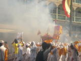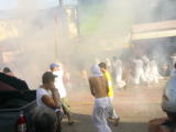 御輿に投げ込まれる爆竹、長い竹から吊られた何メートルもの爆竹、打ち上げ花火、ロケット花火など、そこにいる何万人が一斉にやってるんです。白く煙る視界の中を裸足で歩く人たち、両手を合わせて地面に座り込んだり、耳を押さえて煙から逃げる一般の人たち、多くの人がみんなの幸福を祈りました。